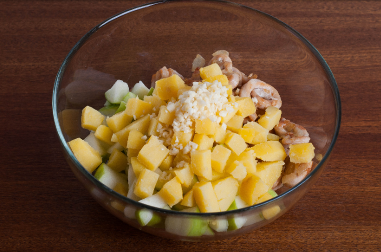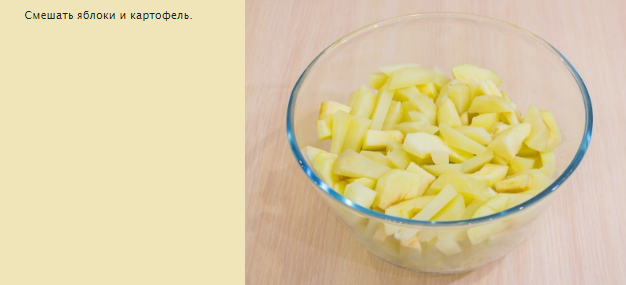 Картофель порезать на кубики, смешать с курицей. Добавить яблоки и чеснок (измельченный).