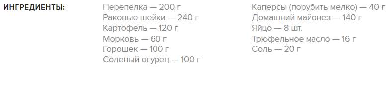 Запекаем перепелку с перцем и солью до готовности в духовке, остужаем, разбираем на филе. Все овощи нарезаем и смешиваем с мясом перепелки, раковыми шейками, приправляем майонезом. Выбираем для салата глубокую тарелку, куда и выкладываем его. Украшаем отварными яйцами перепелов и раковыми шейками. На салат немного капнуть трюфельное масло.