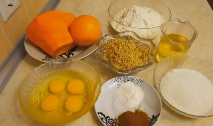 Яйца и сахар взбить, влить раст.масло, туда же цедру апельсина. К муке добавить разрыхлитель, соль, корицу, тыкву (натертую на мелкой терке), грецкие орехи. Перемешать и отправить к яйцам.