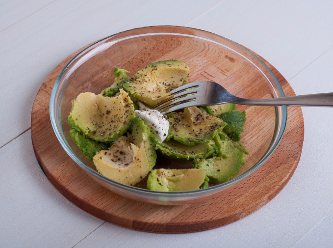 Из авокадо вынуть мякоть и добавить к ней молотый перец и сметану, разомнуть вилкой.