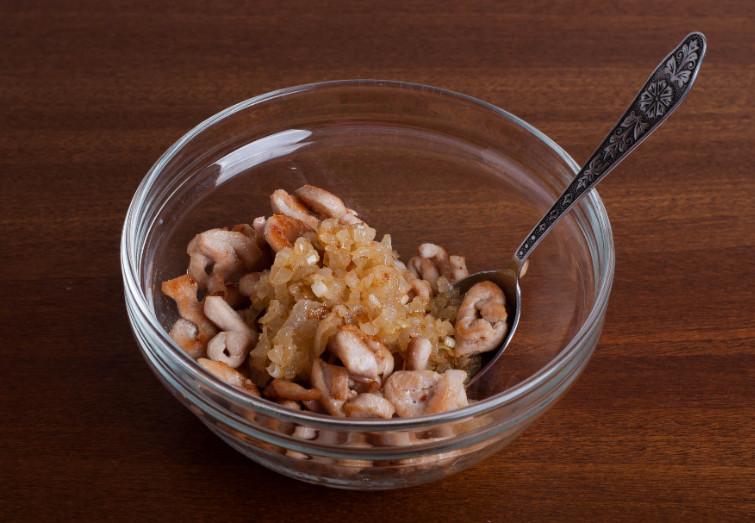Лук, мелко нашинкованный, обжаривать до золотистого цвета и смешивать с курицей.