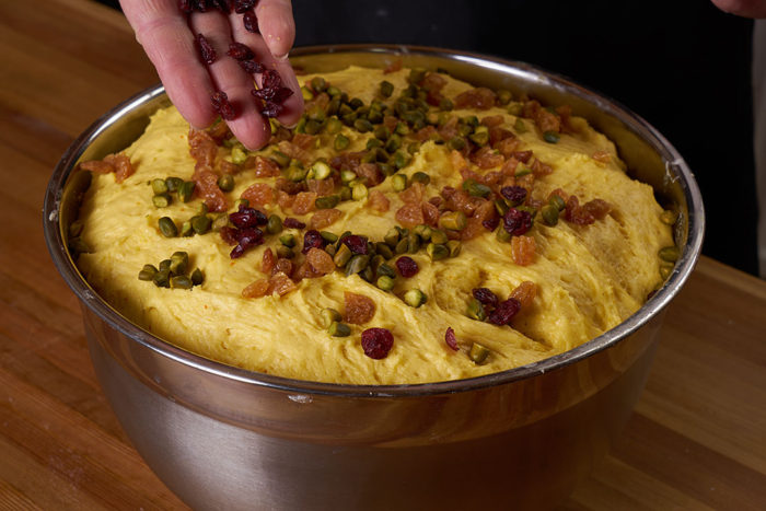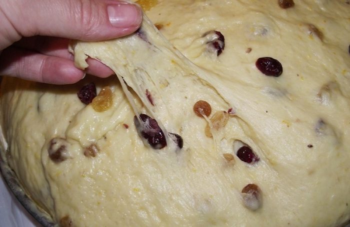 - После вторичного подъема тесто приминают и подсыпают цукаты и изюм, обваленные в муке.