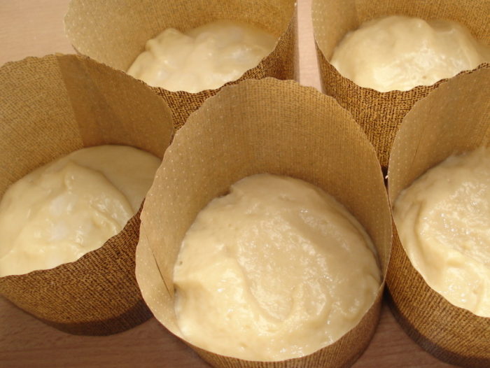 - Раскладывают неполно тесто по формочкам, выдерживают 20 минут. На поверхности куличей можно прорисовать крест и перед тем, как ставить в духовку, смазать раствором желтка в воде (желток+ 1 ст. ложка воды).