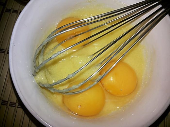 - Затем готовят «заливку». Желтки (яйца) и сахар растирают в однородную массу и взбивают добела.