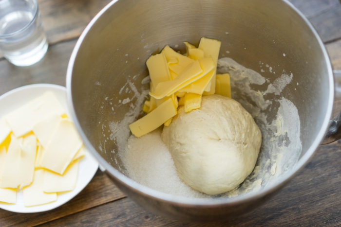 - Добавляют в тесто растопленное сливочное масло постепенно небольшими порциями и снова долго месят.