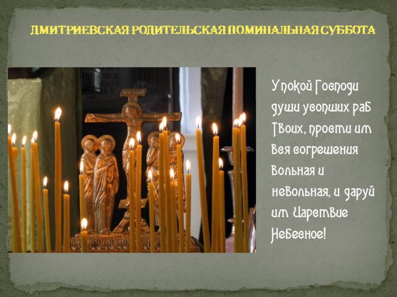 В Дмитриевскую субботу люди обязательно с самого утра идут на службу в церковь, чтобы помолиться и поставить свечи за упокой. Можно оставить батюшке записку в родительскую субботу с прошением провести поминальную панихиду. Только важно указывать в этой записке имя усопшего, которое ему дали при крещении.