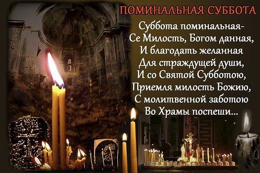 В эти родительские субботы желательно попасть в церковь, потому что православные священники именно в эти родительские субботы проводят особенные службы-панихиды, когда можно поставить свечку, заказать Сорокоуст. Служба в родительскую субботу начинается в 9 ч вечера в пятницу. Ни в один другой день в течение периода, пока длится Великий Пост, заупокойные богослужения не проводятся. После церковного богослужения совсем не обязательно идти на погосты, так как за души усопших молиться можно только в церкви, а не на могилах.