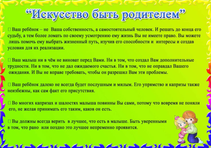 Очень важно продумать информационное наполнение. Здесь необходимо обратить внимание на актуальность подаваемых родителям сведений. Задача состоит в том, чтобы подобрать полезные рекомендации родителям о той или иной возрастной группе. Например, для мам и пап детей младшей группы будет полезно узнать о режиме в детском саду. Тогда дома можно выстроить аналогичный режим, чтобы адаптировать малыша к дошкольному учреждению. Для родителей подготовительной группы важно узнать, как детей готовят к поступлению в школу.