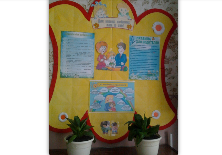 Методисты, исходя из своего опыта, рекомендуют красиво и содержательно оформить родительский уголок. Варианты оформления могут быть различны, обычно это один или два стенда или выделенная полка. Играет роль материальная база детского учреждения и креативность педагогов, возможно использование подручного материала.