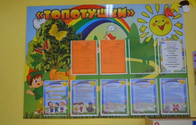 В группах детского сада отводят специальный уголок, где содержится информация для родителей. Это может быть полка или специальный стенд, куда помещаются материалы соответственно возрасту воспитанников и временам года в красочном оформлении с картинками по теме.