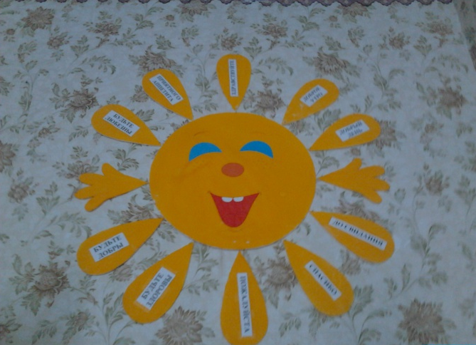 Солнышко с добрыми словами, которые дети закрепляют сами.