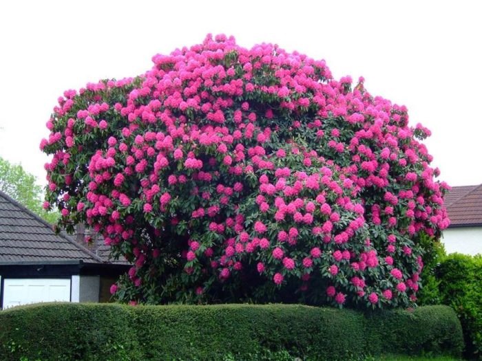 Вечнозеленые сорта рододендрона зачастую представляют собой высокий кустарник, а иногда и раскидистые деревца. Они менее устойчивы к морозам, чем их листопадные родственники, но ничуть не уступают им в красоте: пышные, яркие соцветия особенно хорошо смотрятся на фоне их темной кожистой листвы.
