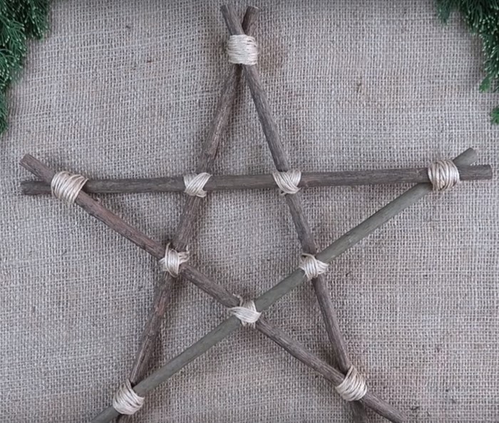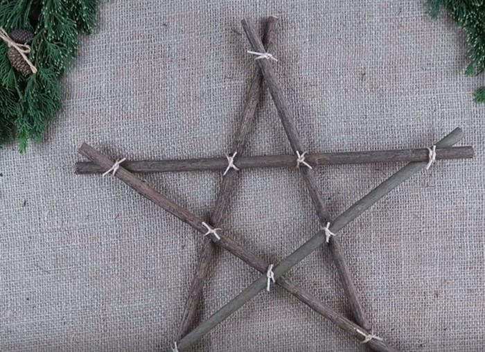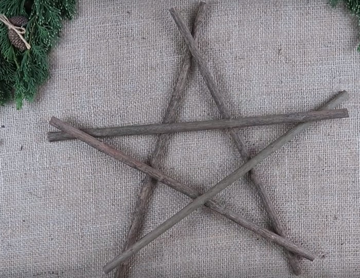 Возьмите веточки деревьев и сложите их в форме звезды, накладывая их внахлест.