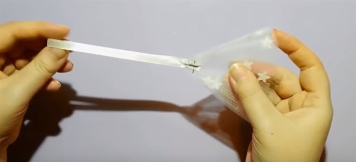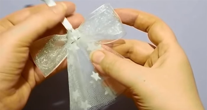 8. Из атласной ленты 0,6 мм шириной отрежьте отрезок длиной 25 см, сложите его пополам и степлером прикрепите к заготовке из фатина.