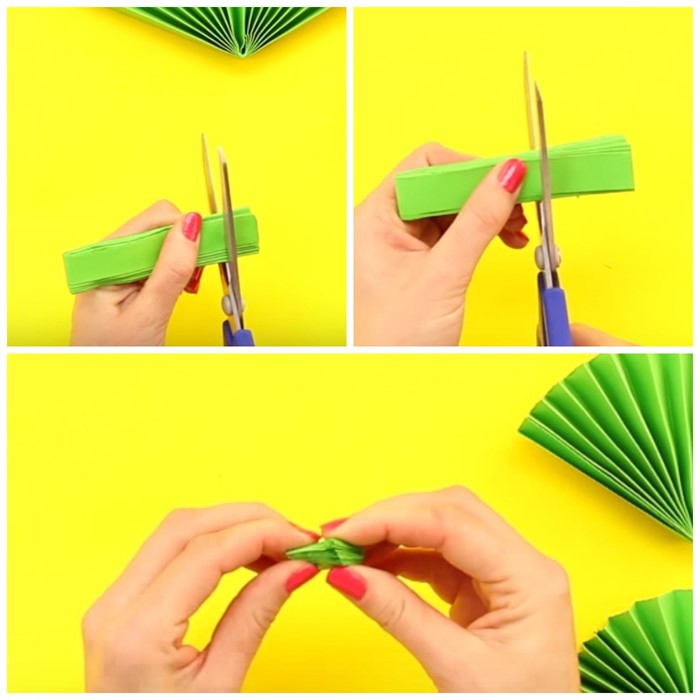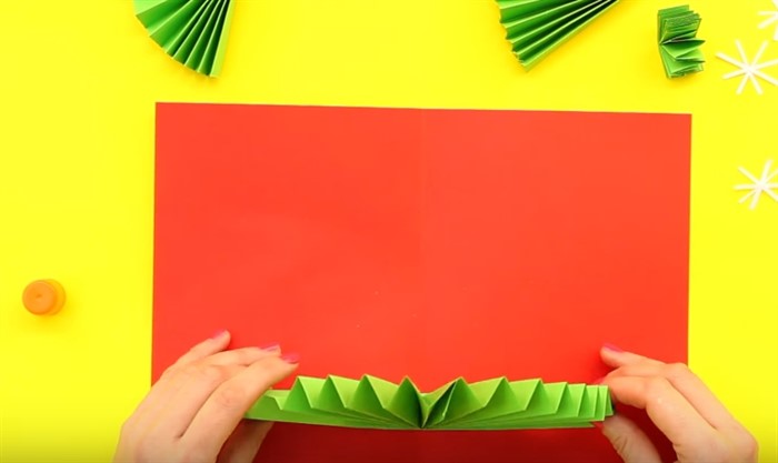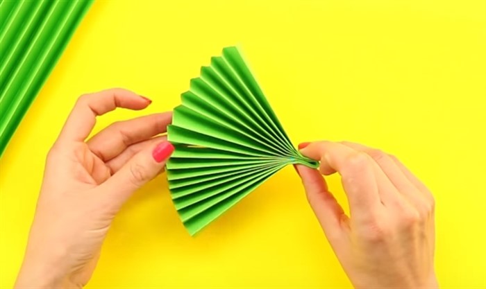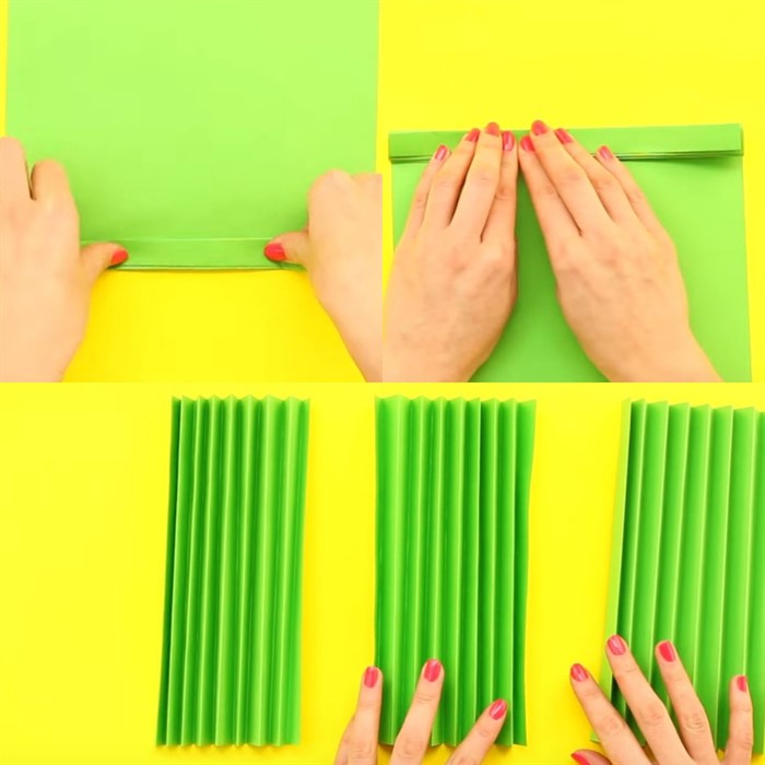 3. Из двусторонней зеленого цвета бумаги сделайте гармошку по всей длине. Ширина гармошки — 2 см. Потребуется 3 таких заготовки.