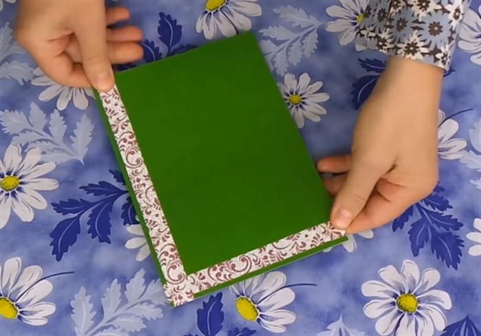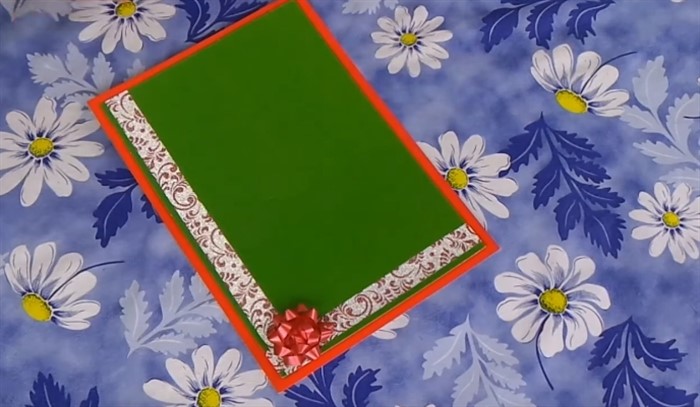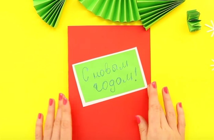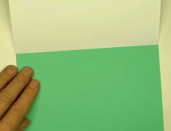 Сложите ее пополам, так чтобы надпись оказалась на внешней стороне. Затем открытку разверните и на внутреннюю правую ее часть приклейте зеленый прямоугольник из бумаги.