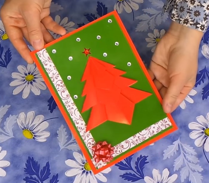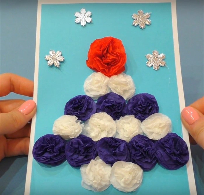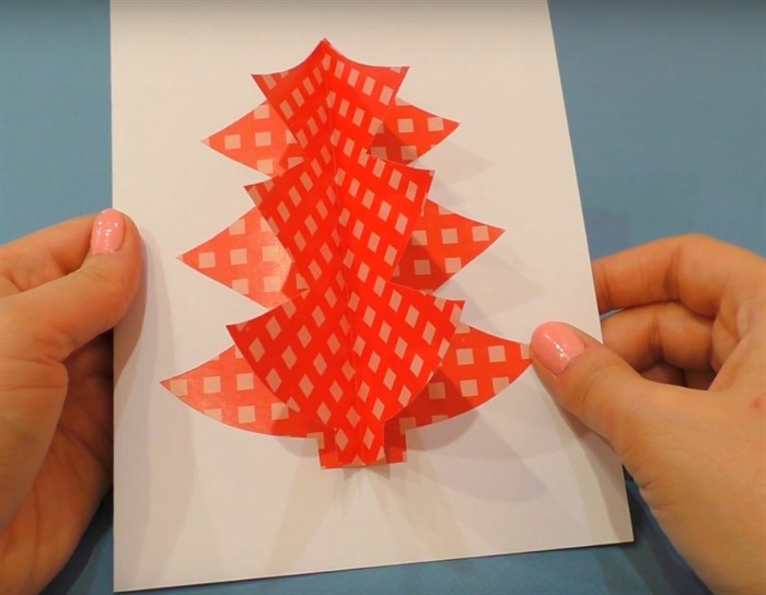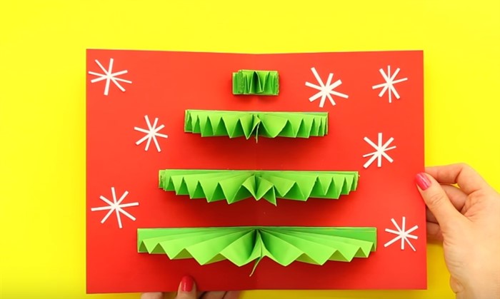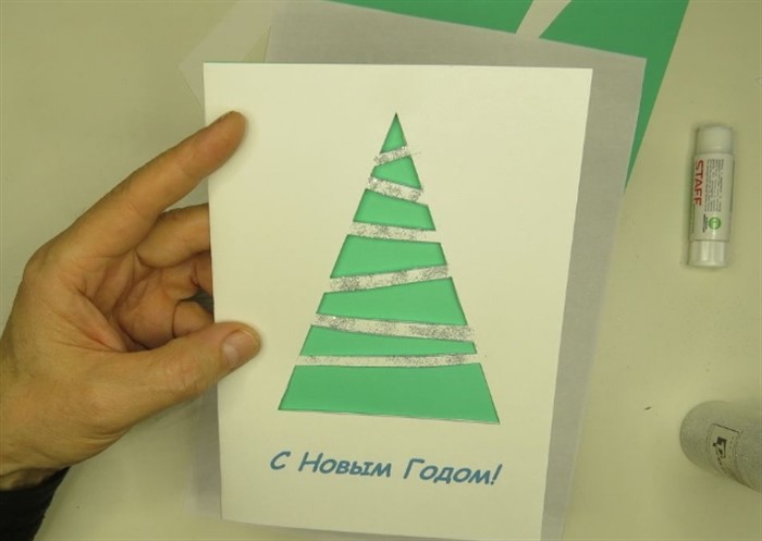 Для следующего варианта потребуется картон белого цвета и 3 одинаковые заготовки из скрапбумаги в виде елочки.