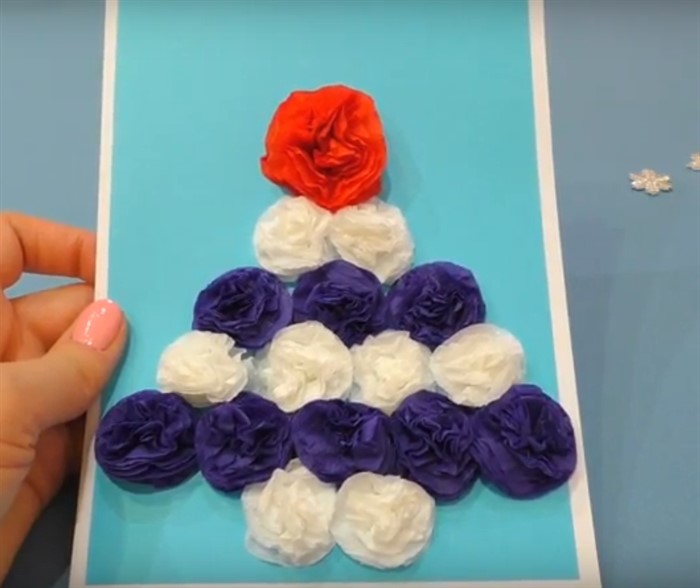 Из салфеток других оттенков сделайте таким же способом еще 16 таких заготовок. Приклейте заготовки к листу картона.