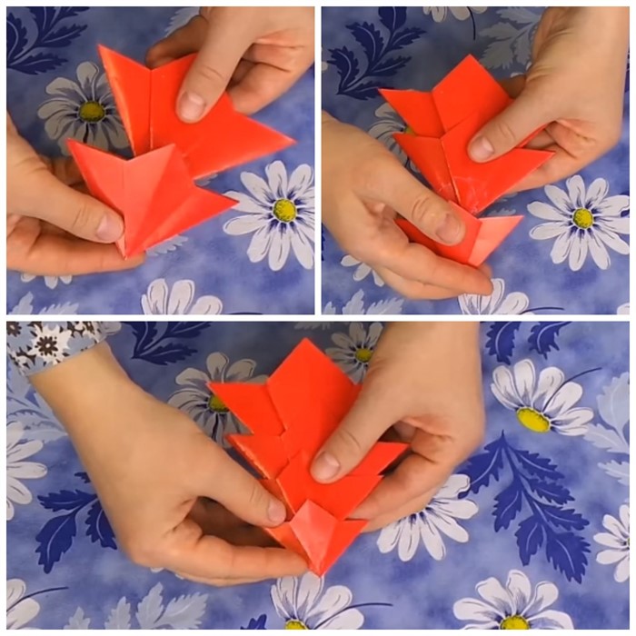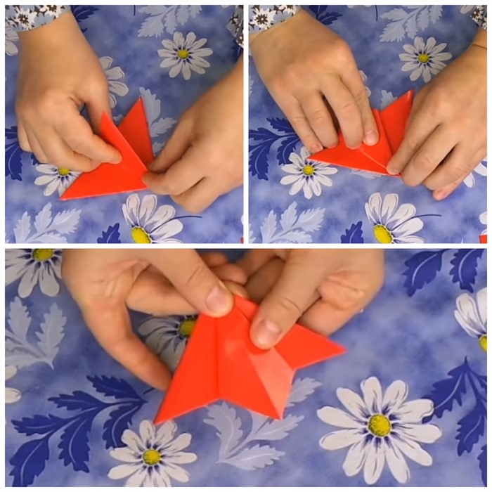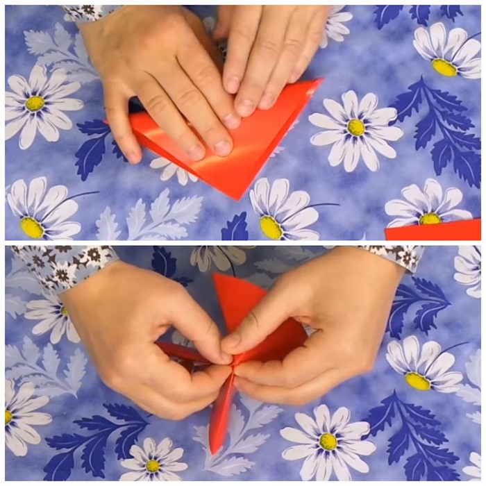 Правый край треугольника отогните в середину. Начиная с острого угла треугольника, расправьте его по центру. Проделайте эти же действия с остальными квадратами.
