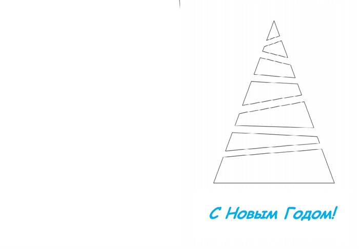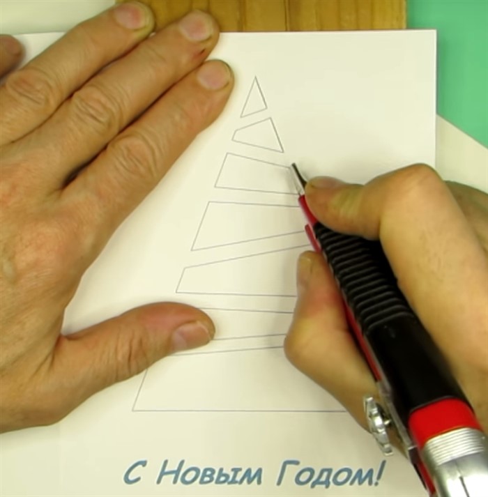 Открытку разверните, положите внутренней стороной на деревянную досточку и канцелярским ножом вырежьте елочку по линиям.