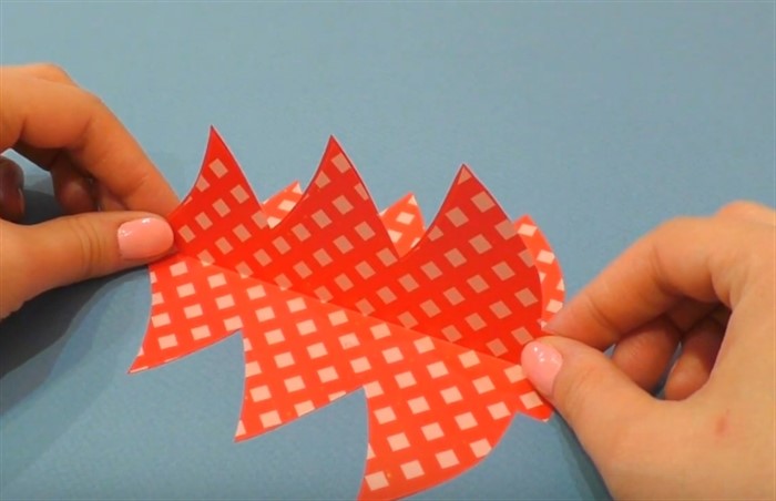 4. Верхнюю часть одной из гармошек промажьте клеем, сложите пополам и склейте. Должен выйти веер. Подобным образом поступите со всеми гармошками.