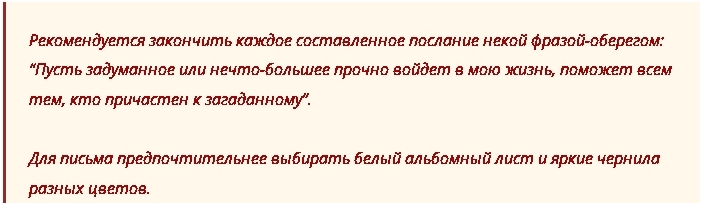 - Нельзя загадывать зла никому, даже если вас кто-то обидел и вы хотите отомстить. Только тот, кто обращается к Вселенной с добрыми намерениями, имеет шанс получить то, что хочется.