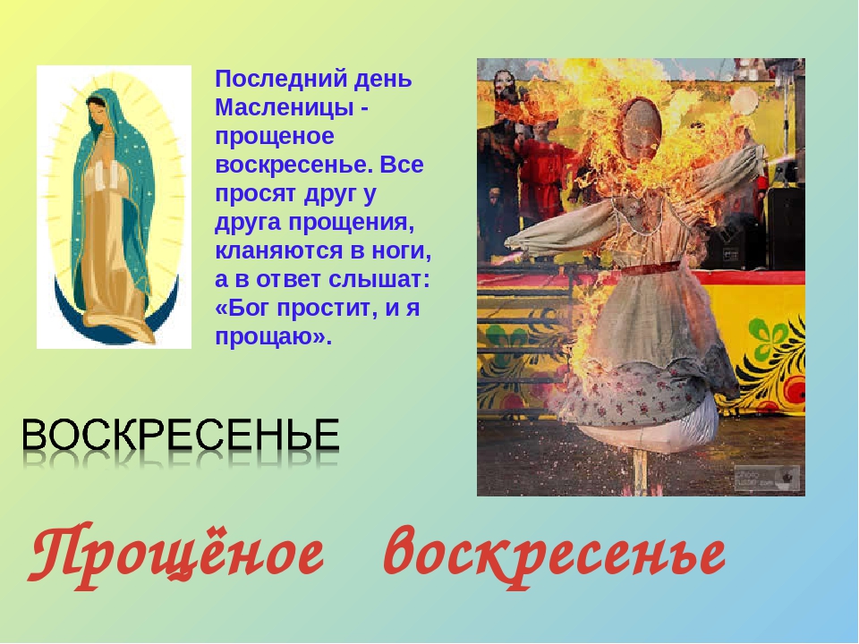• Воскресенье — проводы. Еще этот день называется — прощенным воскресеньем. В этот раз, в гости идут, чтобы попросить прощения. Принято друг друга простить, после чего расцеловаться.