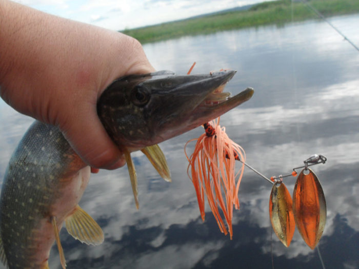 Спиннербейт еще называют блесной-незацепляйкой, которой можно приманивать щуку в любых зарослях. Уголок из проволоки с вращающимся лепестком в верхней части, имеет внизу свинцовую головку с крючком, прикрытую бахромой. Такая форма приманки позволяет не цепляться за водные растения, что очень удобно для рыбалки в заросших местах водоема.