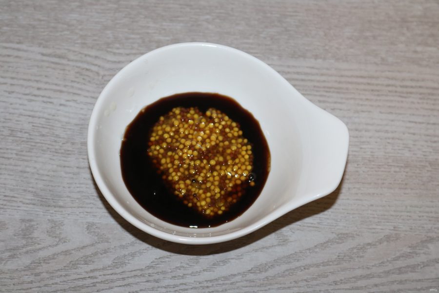 Для заправки смешиваем горчицу, масло, соус соевый, сок из лимона.