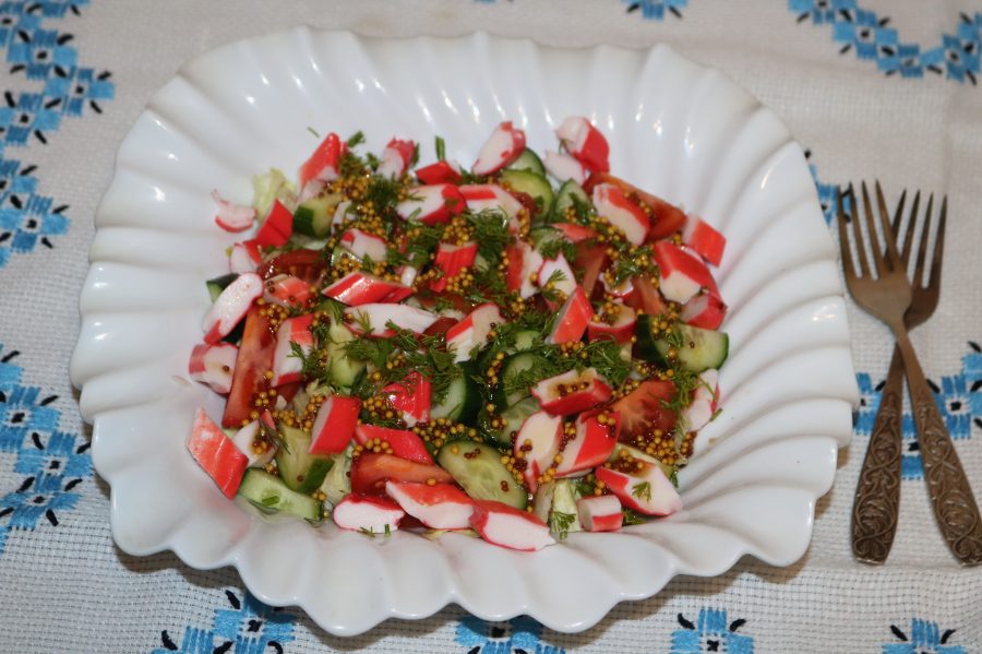 Хотя рецепт и незамысловатый, салатик получается изумительным на вкус, а готовится не более десяти минут. Рекомендуем обязательно попробовать.