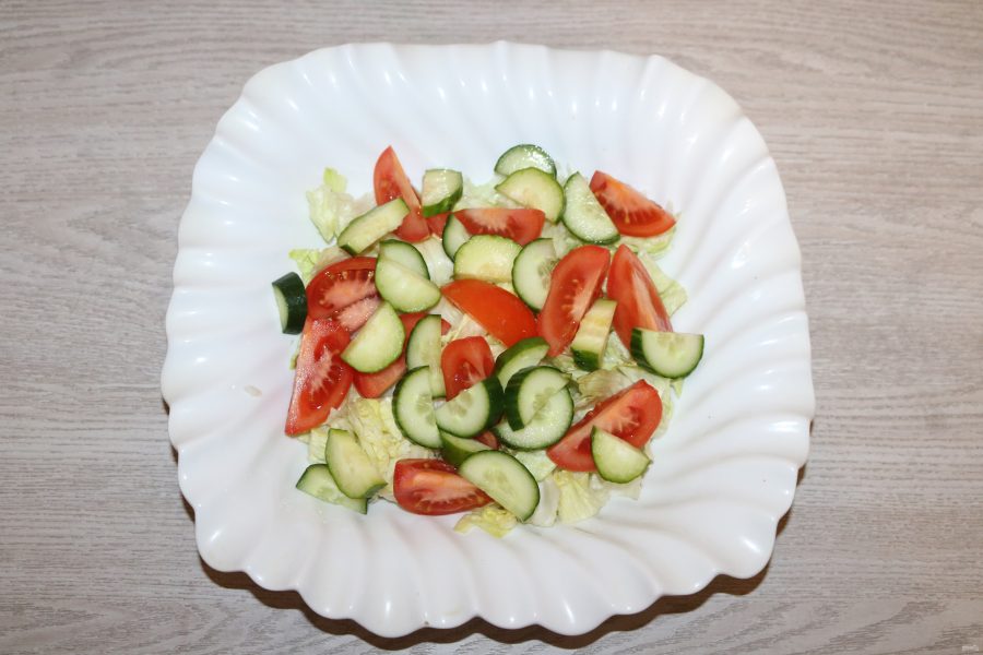 Салат можно готовить порционно либо на большом блюде. Нарвите листочки руками, выложите первым слоем. Порежьте огурцы, помидоры, распределите их сверху.