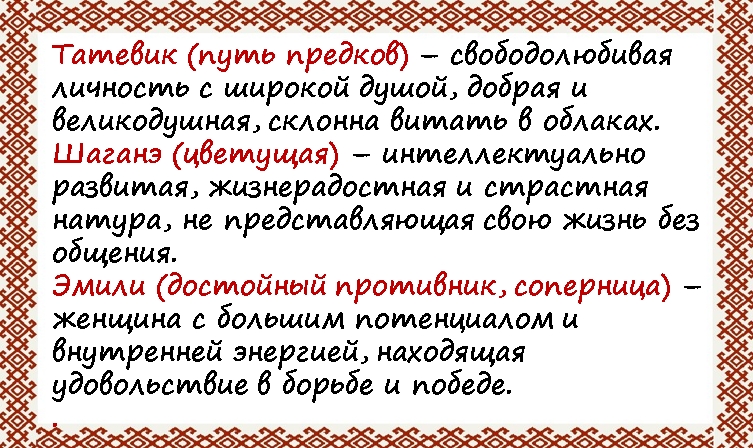 В татарской традиции, при выборе имени, руководствуются традициями, сложившимися на протяжении веков. Одна из них, называть дочерей небесными светилами, например, Чулпан — Венера. А если в имени присутствует частица «ай», значит имя связано с Луной. Другая традиция — заимствовать имена из арабского или персидского языков с глубоким смыслом.