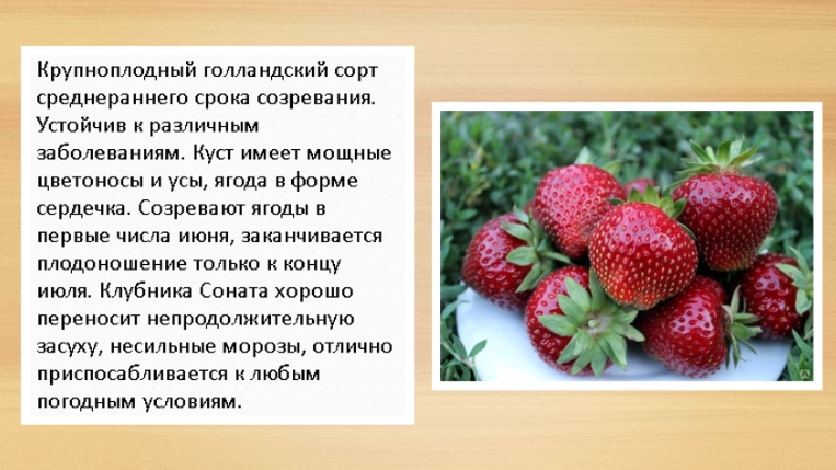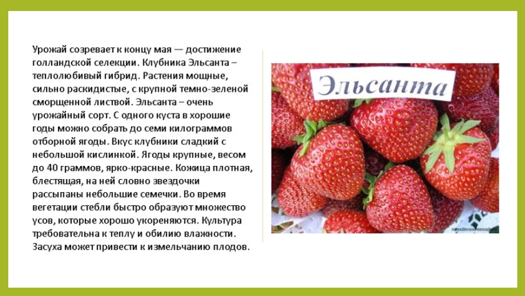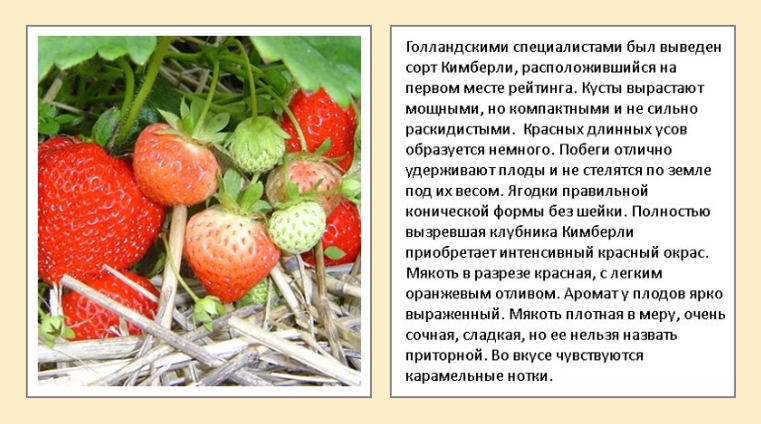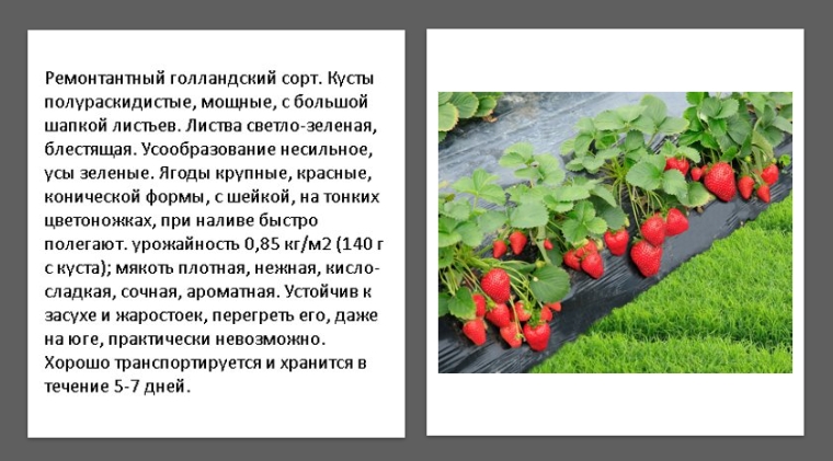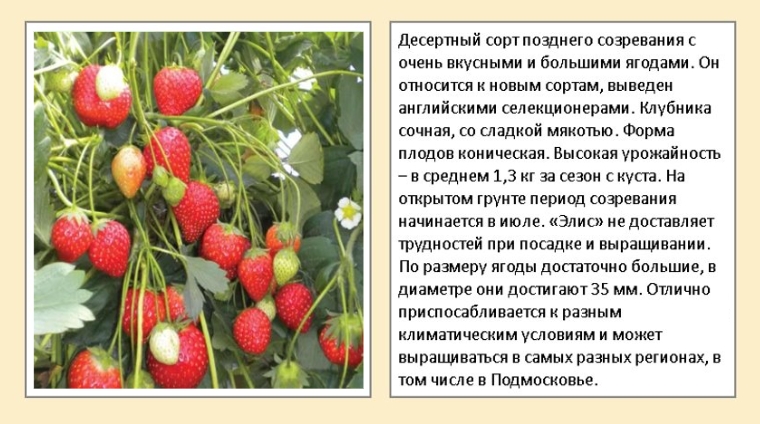 Относится к самым поздним голландским сортам. Урожаи дает неплохие, побеги мощные, отличается малым количеством усов. Плоды хоть и сладкие, но небольшая кислинка присутствует, форма круглая, вес 120 гр. С куста за летний сезон снимается больше 1 кг. В уходе неприхотлив, к заморозкам устойчив.
