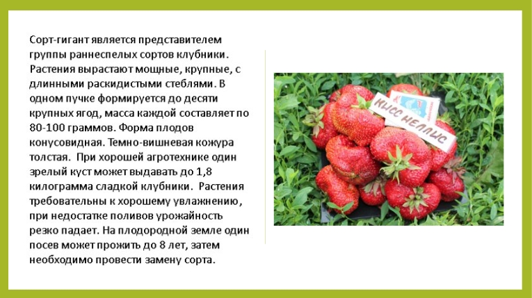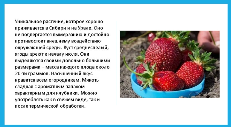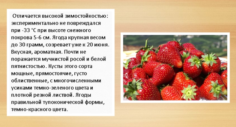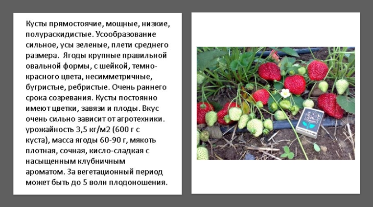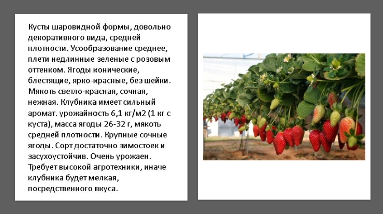 Формирует компактный куст с малым количеством усов, дающий за сезон 1,5 кг. Ягода небольшая яркая с блеском, форма конусообразная, на кончике плоская, вес до 40 гр. Необходим регулярный полив (засуху переносит плохо), а вот морозов не боится.