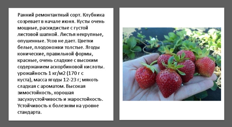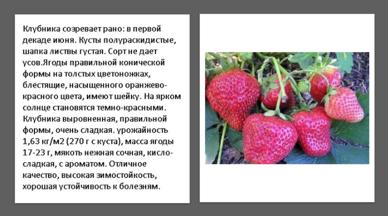 В конце мая уже можно лакомиться ягодами этого сорта. Хлопот много огородникам он не доставит, так как выбрасывает мало усов. Выдерживает морозы до -17 гр. Ягода конусообразная, вес, в среднем, 30-40 гр. Один кустик может дать более 1 кг плодов.