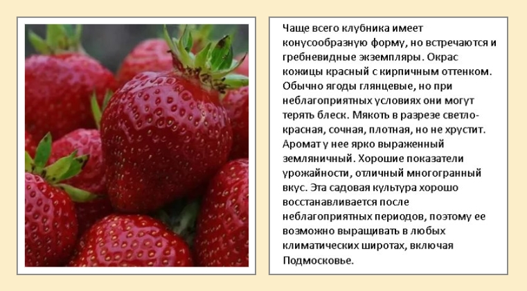 Климат региона отличается довольно коротким летом, холодной зимой и возвратными заморозками в конце весеннего сезона. Учитывая, что клубника относится к капризным культурам, сорт для посадки нужно выбирать внимательно. Сегодня существует много сортов, которые адаптированы под такие условия. Благодаря селекционерам, огородники имеют возможность подобрать нужный вид, который подходит для конкретного участка. Необходимо учитывать плодородность почвы, если в ней не хватает питательных веществ, ягод будет мало и они получатся мелкими. Важно выбрать место для грядки, оно должно быть достаточно освещенное, и соблюдать расстояния между кустами. Некоторые сорта не переносят засуху, в этом случае, нужно следить за увлажненностью почвы. Эксперты опытным путем на протяжении многих лет наблюдали за различными сортами. Ниже вы найдете те из них, которые подходят для культивации в Подмосковье.