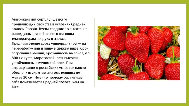 Выведен американцами. Славиться высокой урожайностью — до 1,5 кг., большое количество ягод со сладким земляничным вкусом дает на третий год культивации. К пониженным температурам устойчив, хорошо переносит засушливое лето.