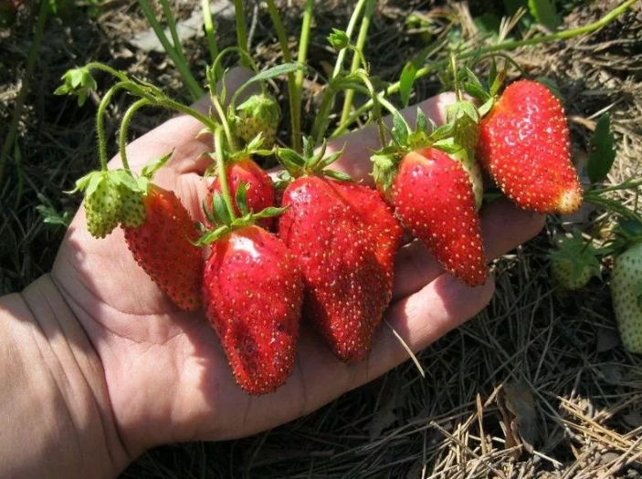 Популярность приобрел еще в советские времена, правильная культивация способствует неплохому урожаю — до полутора килограмм с куста. Плоды до 50 гр., весом, сладкие, конусообразной формы с туповатым концом. Вместе с красным цветом присутствует коричневатый оттенок. Усов выпускает много.