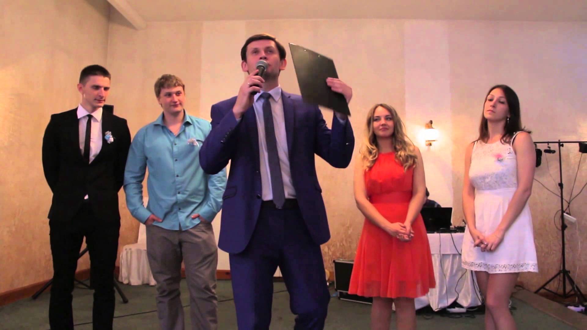 • Тост. Ведущий вызывает из зала несколько человек. Требуется сказать самый оригинальный тост в цепочке участников. Каждый должен продолжить мысль предыдущего тостующего. Ведущий будет показывать слова на бумаге, по очереди участники должны использовать их в своих фразах. Список фраз: комбайн, коммуникабельность, пить, секс, огонь, старость, открытка, бомба, волосы, интрига, бревно;