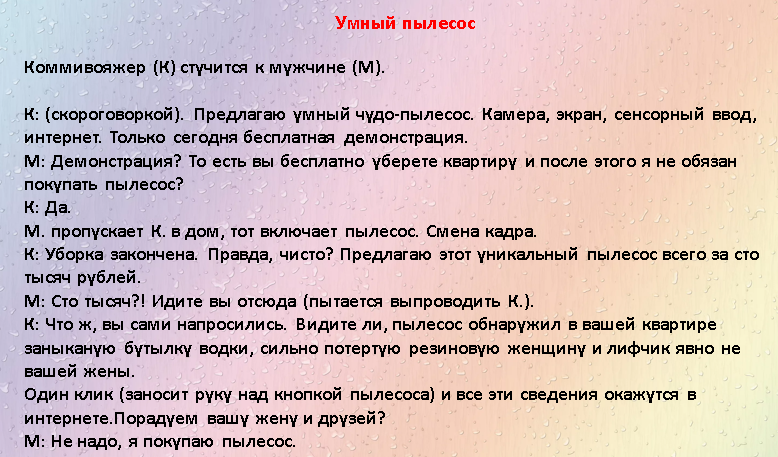 - Авдотья: Тямофей, слухай меня, ты ж грамотный человек, ученый, околачивался всю жизнь возле депутатов, все законы знаешь. Прошу тебя, помоги разобраться мне.