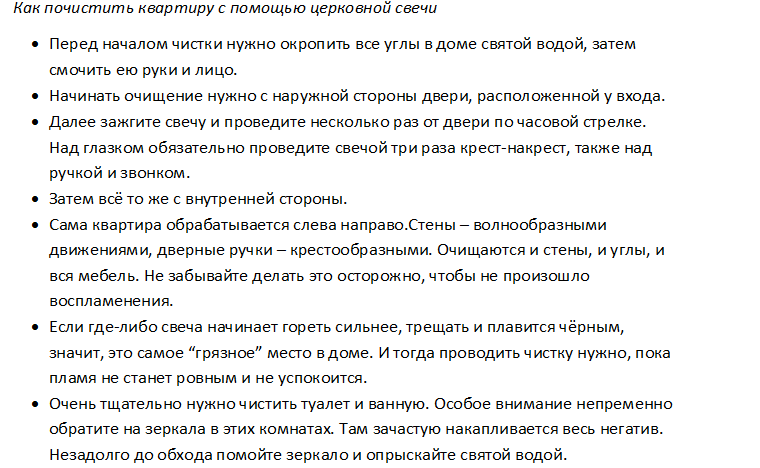 Для этого нужно иметь небольшие восковые свечи, купленные в церковной лавке. Чистка проводится по движению стрелки часов, начиная с левого угла к правому накрест, потом с правого к левому. Такое же правило касается окон и дверных проемов. После завершения процедуры, свечу в блюдце оставляют догореть посредине каждой комнаты. Нужно пройти все комнаты, даже подсобные помещения. Ритуал очистки может совмещаться с освящением комнат святой водой, окуриванием ладаном.