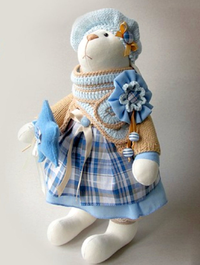 Возьмите старый свитер и вырежьте прямоугольник, размер рассчитывайте по своему усмотрению. Сложите его пополам и прошейте. Наполните ватой или синтепоном. Поделите на две части, одна поменьше — это будет голова (часть ткани затяните на макушке и обрежьте лишнее, чтобы получились длинные уши), другая побольше — туловище. Между ними завяжите потуже ленту. Используйте декор по своему усмотрению.