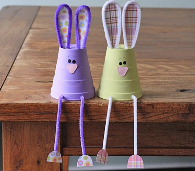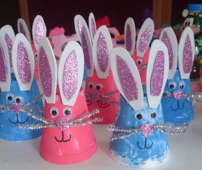 Пластиковые стаканчики тоже могут пригодиться. Покройте их краской, переверните, нарисуйте мордочку и приклейте бумажные уши. Дополните поделку декоративными элементами.