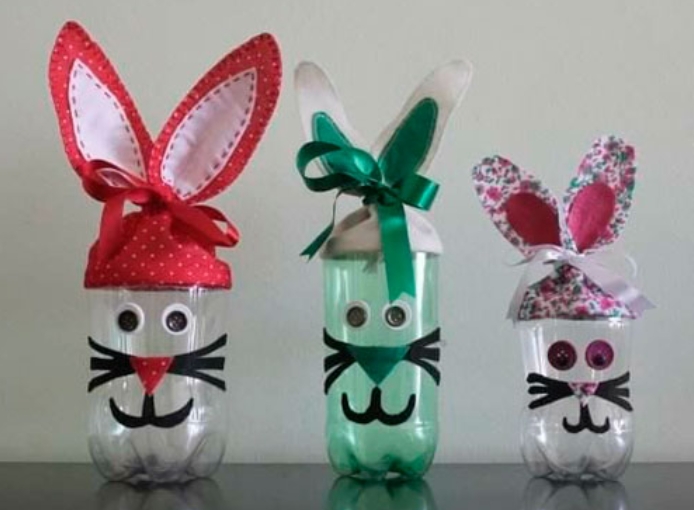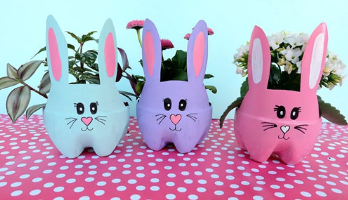 Смастерить кролика можно и из пластиковых бутылок, если их не выбрасывать, к новому году у вас будет отличный материал для поделок. Одна из идей — сделать горшки для цветов. Для этого нужно вырезать необходимый силуэт, покрыть пластик краской и дорисовать необходимые элементы — глаза, усы, нос и внутреннюю часть ушей.