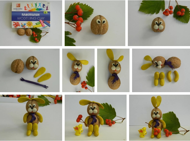 Поделки из пластилина очень любят дети. Дополнительно используйте природный материал, скорлупки грецкого ореха отлично подойдут для этой цели.
