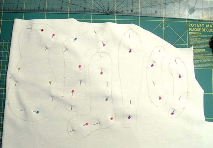 - Положите на нее эскиз, обведите мелом , добавьте по контуру припуски на швы, пометьте места, через которые заготовка будет выворачивается на лицо.
