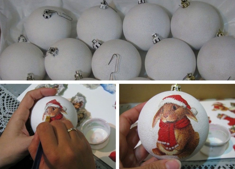 Вам понадобятся елочные шары и бумажные салфетки с принтом «кролик».