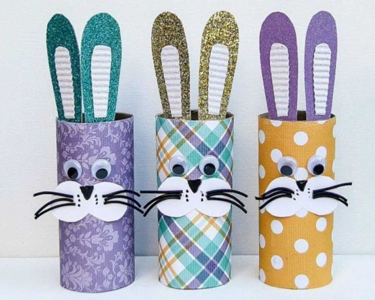 Часто для поделок используют картонные вкладыши от туалетной бумаги или от бумажных салфеток. Это, пожалуй, самый простой способ сделать игрушку-кролика. Втулку обклеивают цветной бумагой или разрисовывают. Ушки вырезают из картона и приклеивают. С такой поделкой вполне справиться и маленький ребенок, обязательно вовлекайте его в творческий процесс.