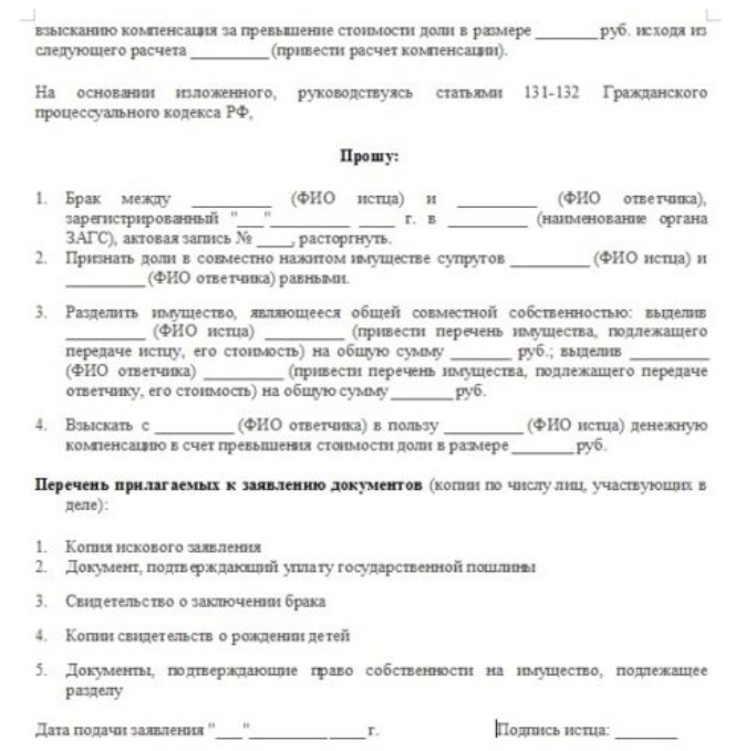 образец исковое заявление раздел совместно нажитого имущества