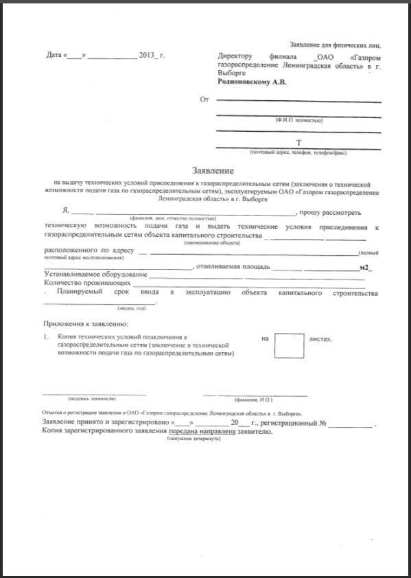 - Заявление на подключение газа к частному дому